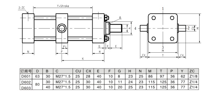 以下為中間銷軸安裝的低壓拉桿液壓缸的尺寸圖及參數(shù)。